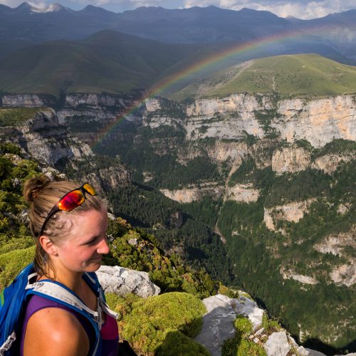 Vanaf de parkeerplaats volg je het grindpad omhoog tot je bij een hokje komt. Hier neem je het pad rechtsaf richting de Mondoto. Volg de gele en blauwe markeringen (punten en pijlen). Als je in het grasland komt zijn de steenmannetjes ook een goede wegwijzer. Blijf het pad naar rechts omhoog volgen tot je op de top van de Pico de Mondoto staat, aan de rand van de Añisclo. Wij hadden hier het geluk om een prachtige regenboog te zien. Vanwege het naderende onweer moesten we helaas ook weer snel afdalen, maar het is bij goed weer een mooie plek om te picknicken!